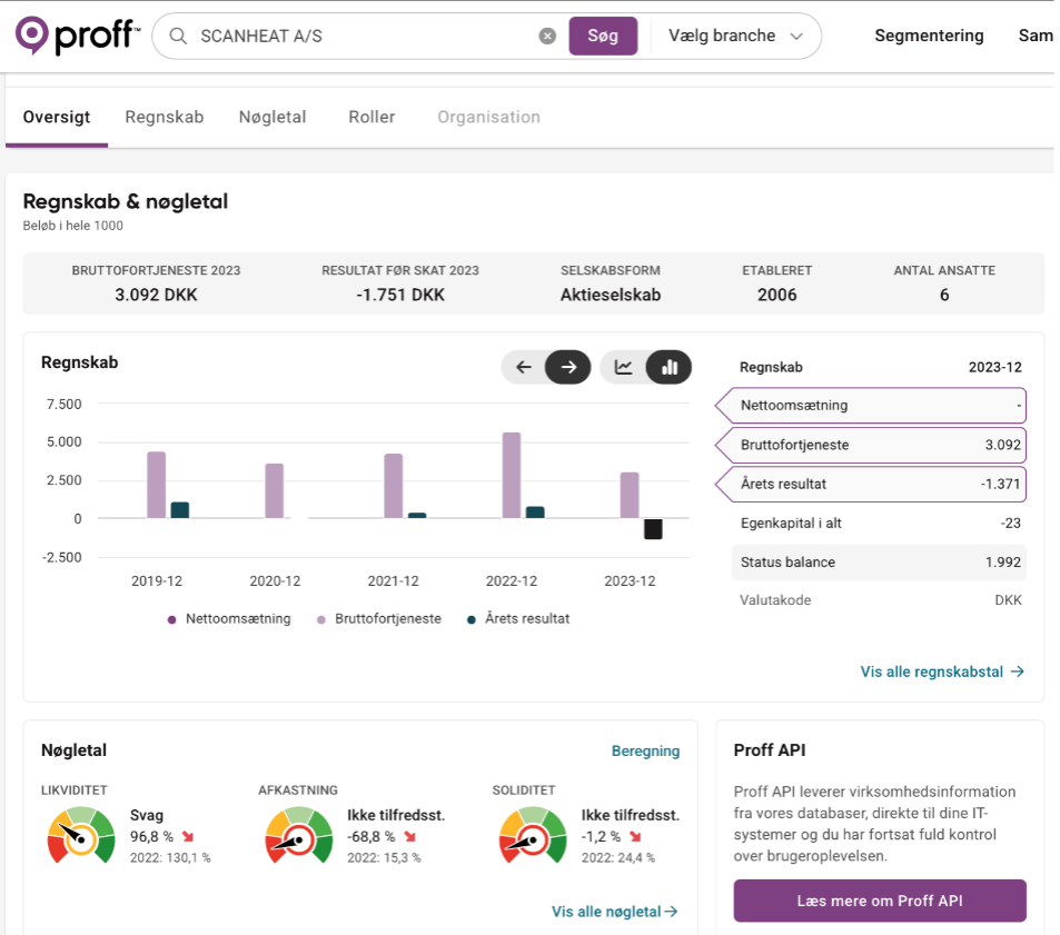 Som det fremgår ved en simpel søgning på proff.dk på ”Scanheat A/S”, så er der en negativ egenkapital, og der er ligeledes en tendens til underskud det sidste år. Desuden er de fleste parametre røde.