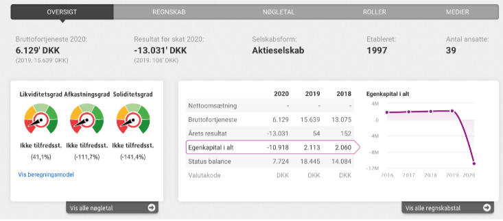 Som det fremgår ved en simple søgning på virksomhedens navn, så kan man hurtigt konstatere, at virksomheden har haft et KÆMPE underskud 2020 på 13 mio. kr. og egenkapitalen er på minus 10.918.000kr.